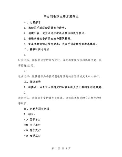 羽毛球混合团体赛是一项富有挑战性的体育赛事。通过小编提供的方案,相信您能成功举办一场精彩纷呈的赛事。祝愿所有参赛选手在比赛中取得优异成绩,共创美好回忆!
