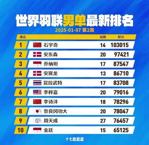1.中国:作为羽毛球运动的发源地之一,我国在羽毛球领域具有极高的地位。