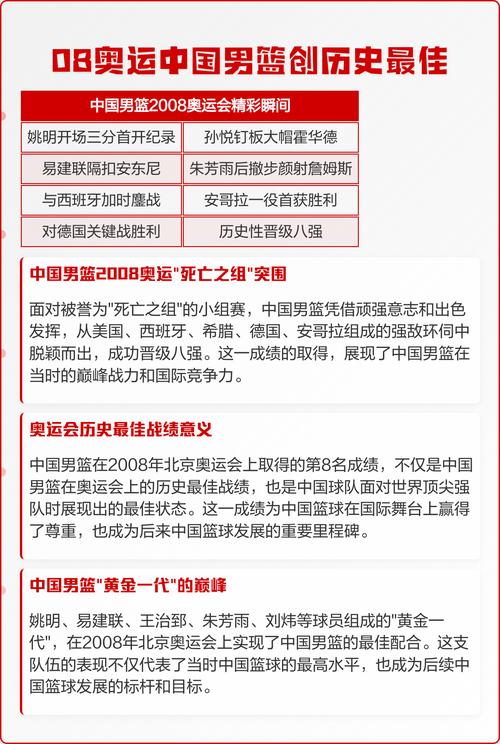 📝 文章摘要:一、中国08男篮的辉煌历程回顾(图片来源网络,侵删)在08年北京奥运会上,中国男篮的表现无疑是中国篮球史上的一个重要里程碑。那一年,男篮队员们团结一心,勇往直前,用他们的汗水和拼搏赢得了无数球迷的敬意。小编将为您详细解析中国08男篮在奥运会...
